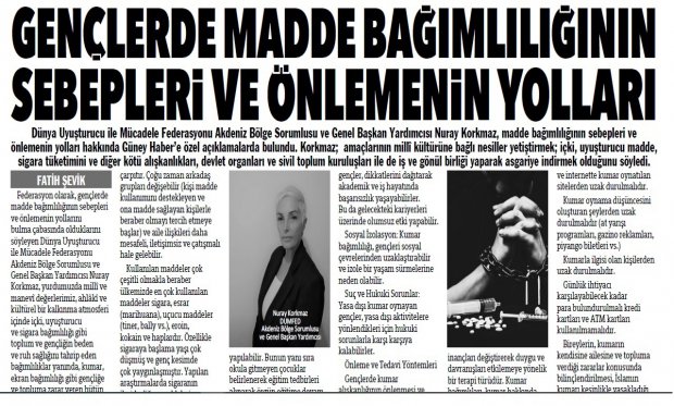 Dünya Uyuşturucu ile Mücadele Federasyonu Akdeniz Bölge Sorumlusu ve Genel Başkan Yardımcısı Nuray Korkmaz, madde bağımlılığının sebepleri ve önlemenin yolları hakkında Güney Haber’e özel açıklamalarda bulundu. Korkmaz; amaçlarının millî kültürüne bağlı nesiller yetiştirmek; içki, uyuşturucu madde,